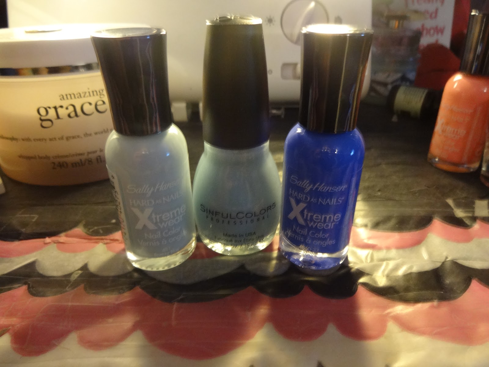 | (From Left to Right: Sally Hansen Xtreme Wear in Breeze Blue, Sinful Colors in Cinderella, Sally Hansen Xtreme Wear in Pacific Blue) |